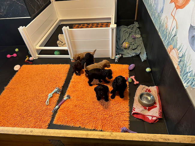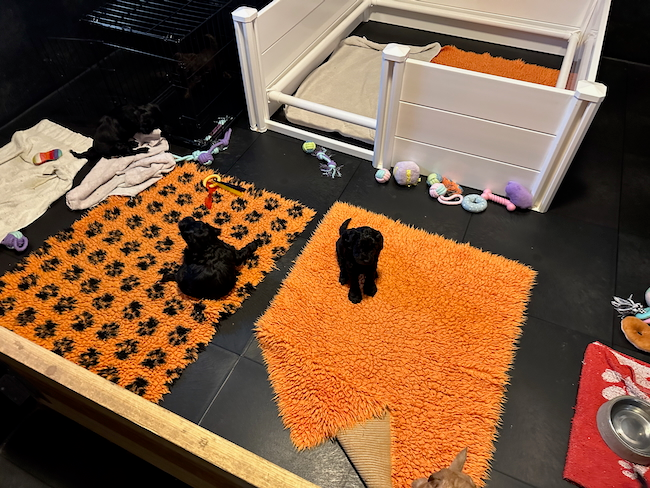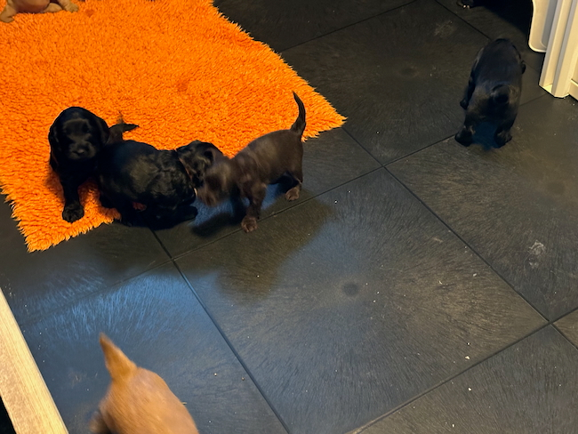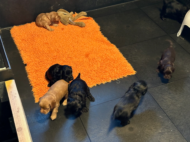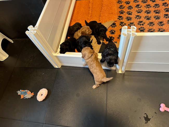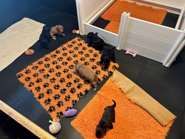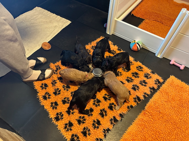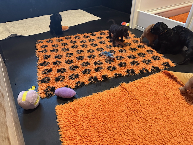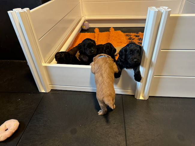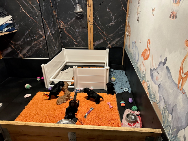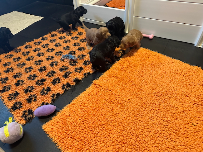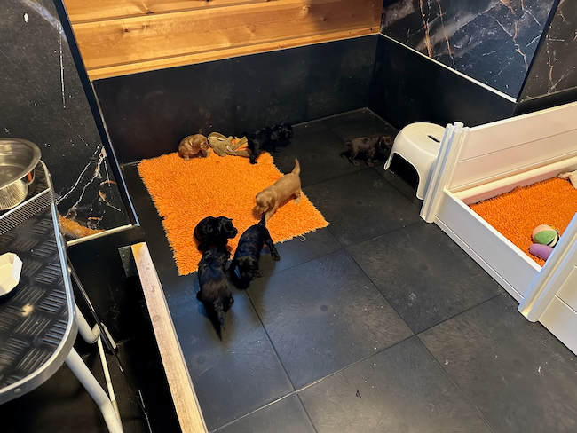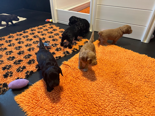 Vandaag zijn ze ruim 5,5 week jong en ze ontwikkelen zich geweldig mooi. Aankomende woensdag gaan ze voor het eerste autorijden en mogen ze op bezoek bij de dierenarts voor de controle, chippen en de eerste enting. Daarna gaan wij de verdelingen bekend maken.