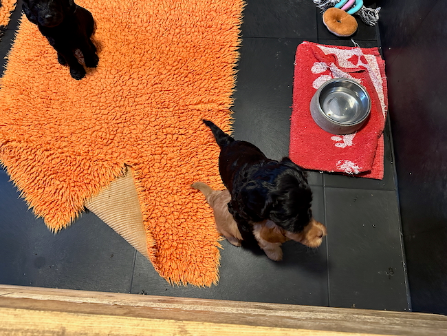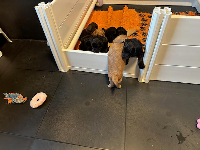 Charly is ontzettend lief naar de pups en naar ons. Ook het bezoek vindt ze allemaal prima, maar lijkt wel een oogje in het zeil te houden van afstand.